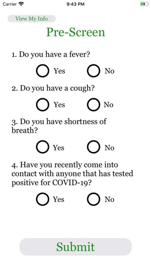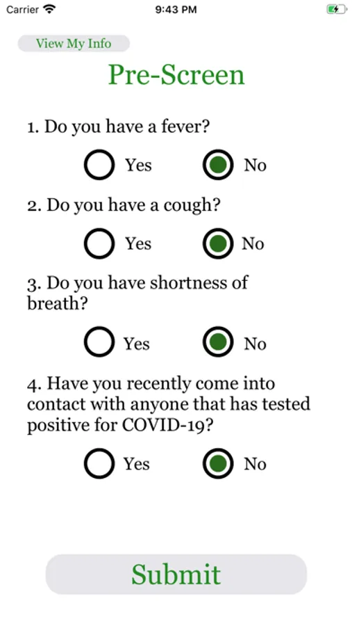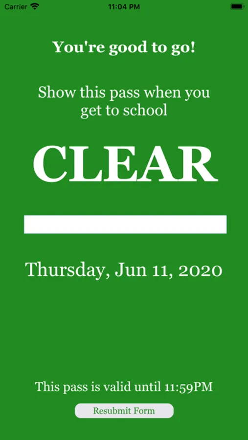 COVID19 Pre-screening questionnaire to expedite entry to campus for faculty, staff, and students. Allowing the school to monitor individuals coming on campus to help ensure the safety of all. Ease of ability to monitor for those with symptoms or a possible positive test to COVID19. Answers to questions will either give a "Clear" screen to proceed to campus entry or secondary screening. Students and staff will complete the questionnaire in the app each day before arriving to school.