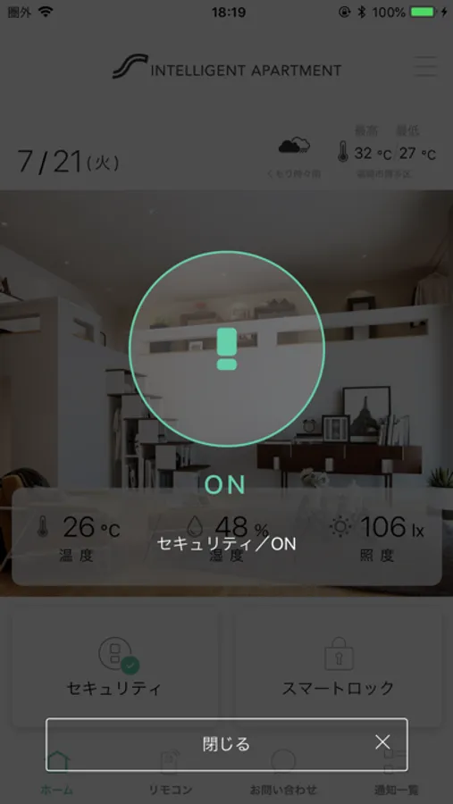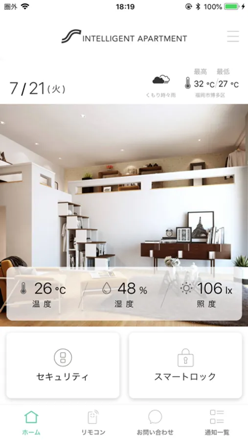部屋の温度・湿度・照度の確認、ホームセキュリティの操作、家電の操作など、外出先から遠隔で管理、操作できます。