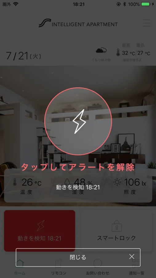 お部屋に設置されているセンサーが窓の開閉や振動、人の動きを検知すると、大音量のブザーで侵入犯を威嚇をして、スマートフォンに異常を通知します。