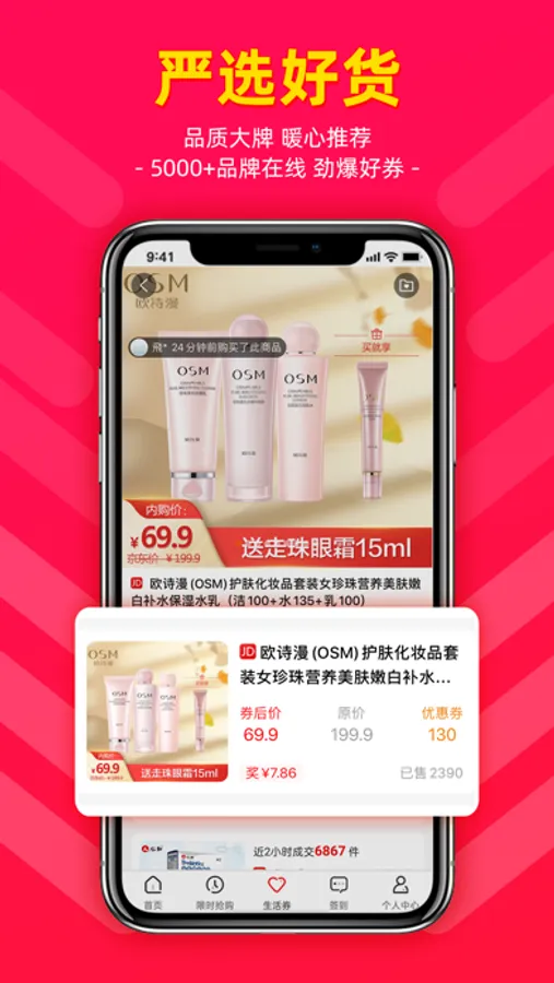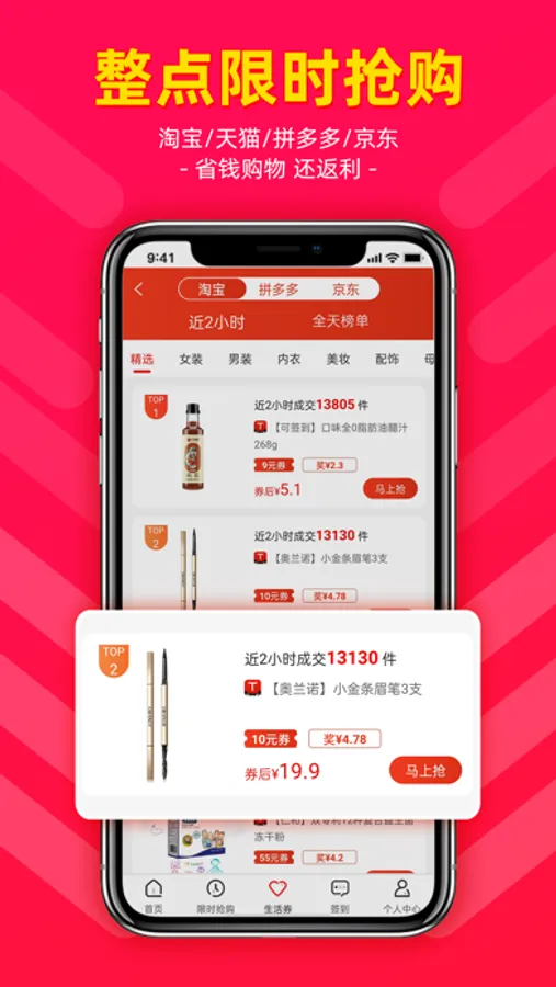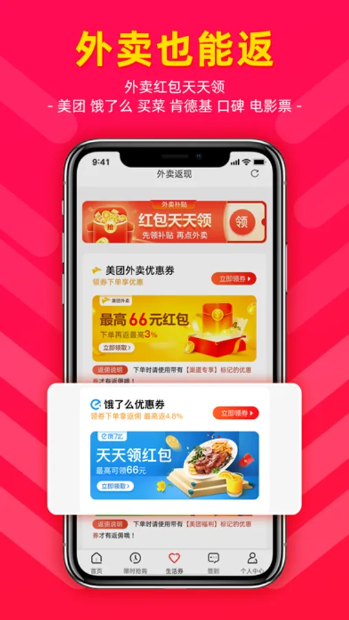 各大网购及外卖平台合作省钱的返利特卖APP;购物用“省钱好券”APP比直接购买产品,省50-90%;还可以叠加大额优惠券,领券购买再拿返利,真的是太省钱了;更有9.9元封顶包邮专场,限时低价等特色专区、签到赚积分,等你来拿!新人专享免单,0元购买,买多少返多少。一键搜索,转换链接,方便好用;爆款商品秒不停、全网热卖品质单品即时更新。