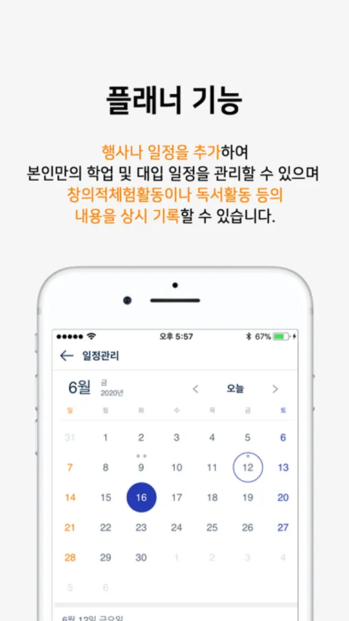 주요기능 : 일정관리 기능/비교과활동 관리기능/내신성적 관리기능/전국연합성적 관리기능/대입뉴스 제공기능/관심대학 관리기능/대입정보 제공/추천대학 제공기능