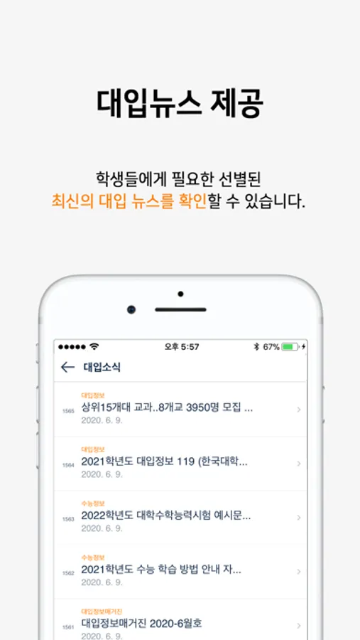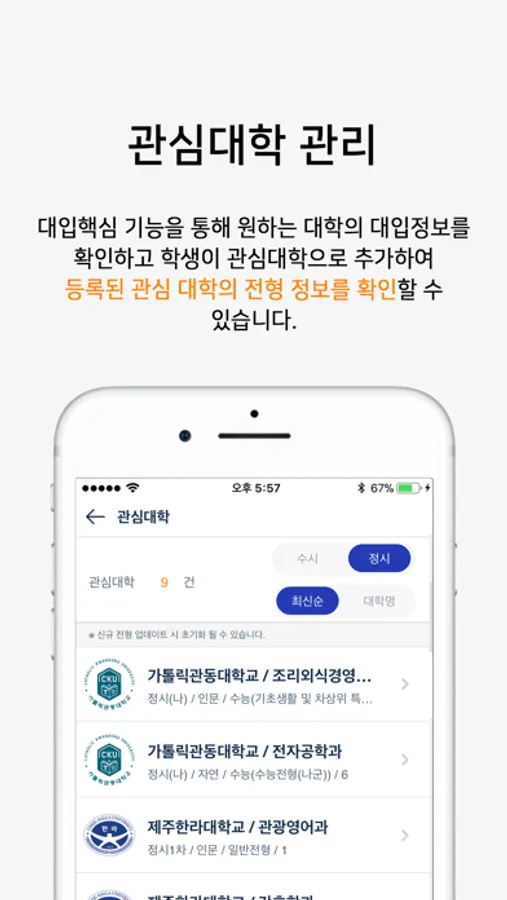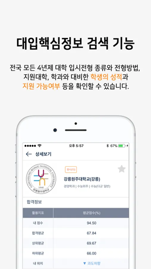 - 전형유형, 지역, 모집단위 등의 검색방식을 선택하여 최신의 대입정보를 조회 및 점수 산출 서비스를 통해 합/불 예측