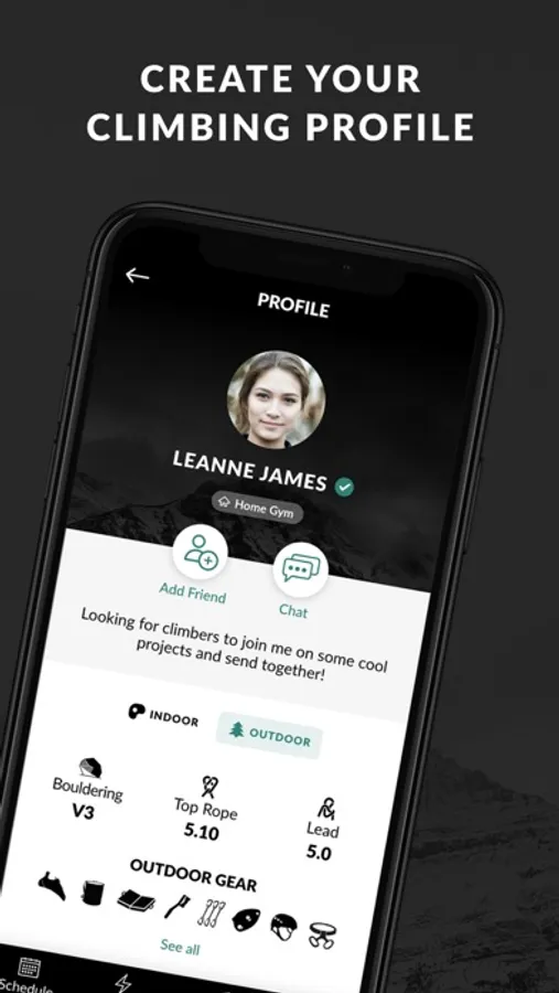 Information and safety are key to climbing. Let your potential partners know your home gym and what you bring to the session! From climbing experience to gear, you can log it all. We even include a space for you to write a personalized message!