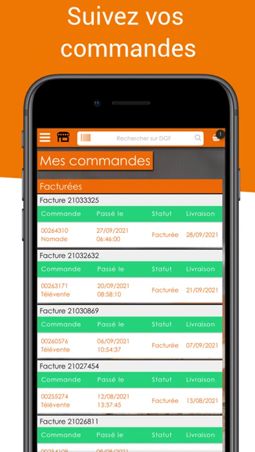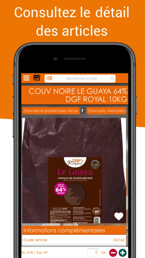 L’application DGF permet à tout client, doté d’un compte d’avoir accès à son espace personnel pour gérer son activité et passer commande en ligne 24h/24 et 7j/7 sur une large gamme de produits dédiée aux professionnels de la boulangerie pâtisserie : Boulangerie (viennoiserie, levure, mix pain...), Pâtisserie (chocolat, fruit, nappage, sucre...), Snacking (fromage, charcuterie, volaille, œufs, légumes, salades ...) Boutique (emballages pâtisserie et snacking, boissons), et Hygiène.