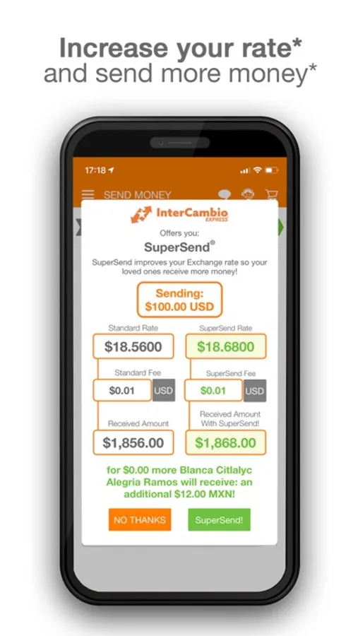 Download the InterCambio Express app and start sending money to your family members now, from and wherever you want. Choose the exchange rate that suits you best, using SuperSend®.