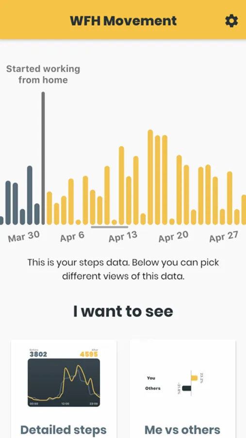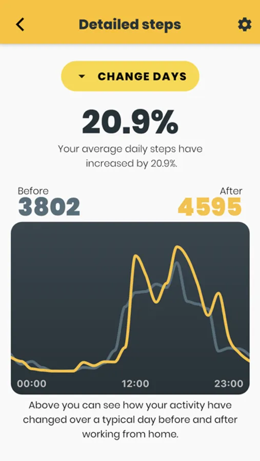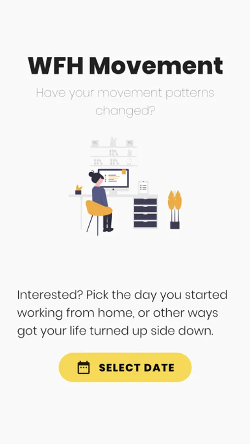 By picking a date where you started working from home, you will be able to explore whether your movement patterns have changed since you started working from home. The app visualizes your movement in the form of steps data from your phone, through Apple Health, Google fitness or Garmin.