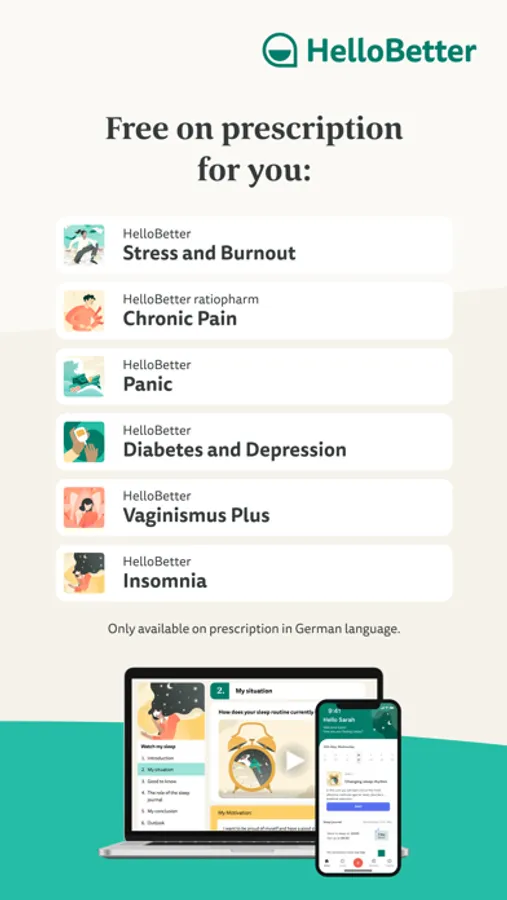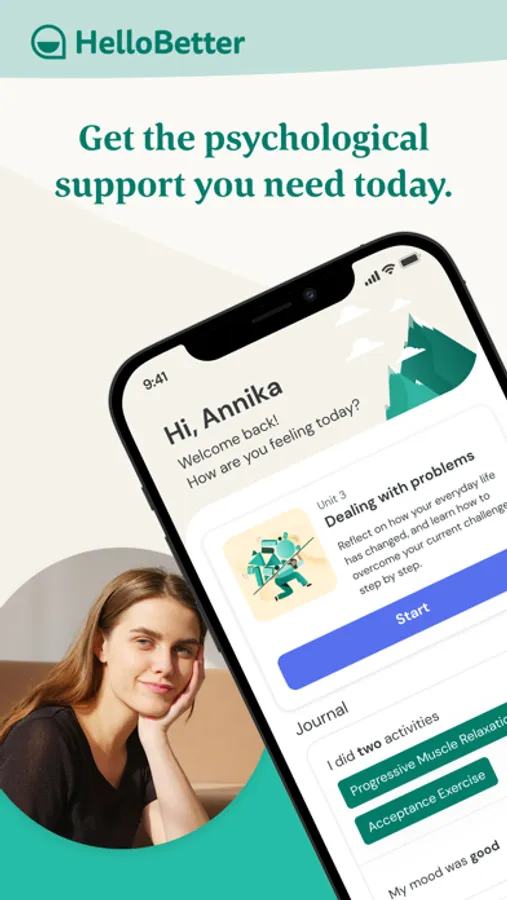 With HelloBetter, you get effective psychological support - without waiting time, and free of charge on prescription. Psychological support - no matter where you are? You can get it with the HelloBetter app. Developed by psychologists and psychotherapists.
