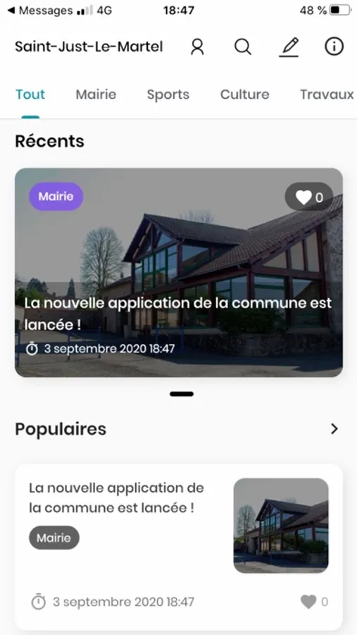La commune de Saint-Just Le Martel propose ce service public et ouvert à toutes les personnes qui souhaitent connaître les informations utiles sur la commune (informations officielles de la mairie, travaux sur la commune, informations sur l'école, résultats sportifs, etc.). Si vous remarquez quelque chose d'anormal sur la commune, n'hésitez pas à utiliser la fonctionnalité Signalement pour envoyer directement une photo et une description du problème au service de la Mairie.
