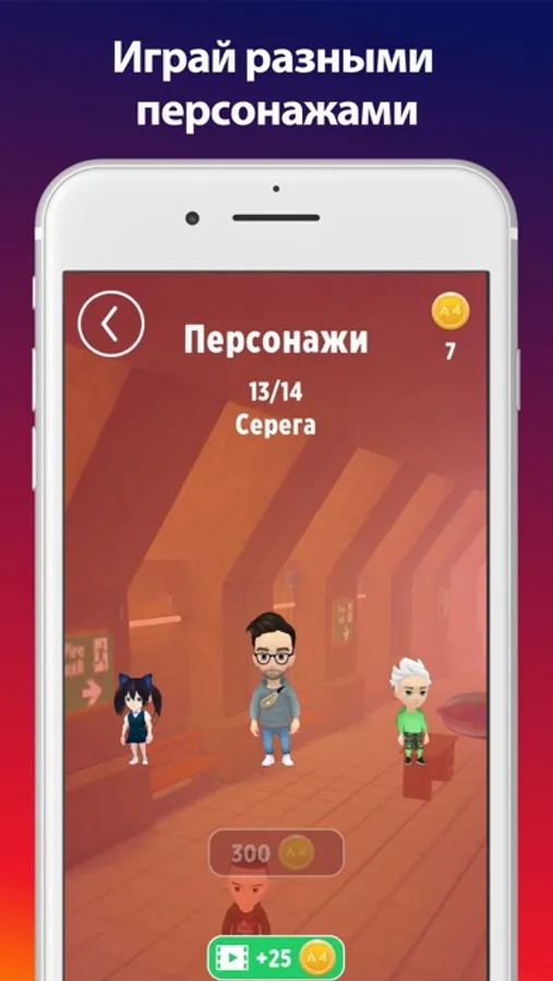 - Выбор персонажа: Глент-атлет, Кобяков в костюме енота, Влад в костюме черепашки, злой клоун, охотник, силач и многие другие