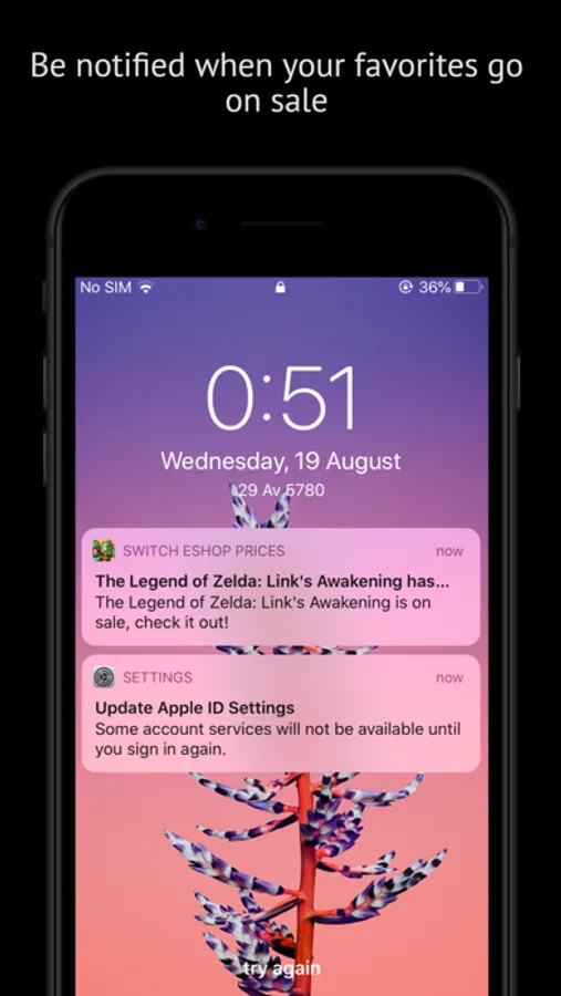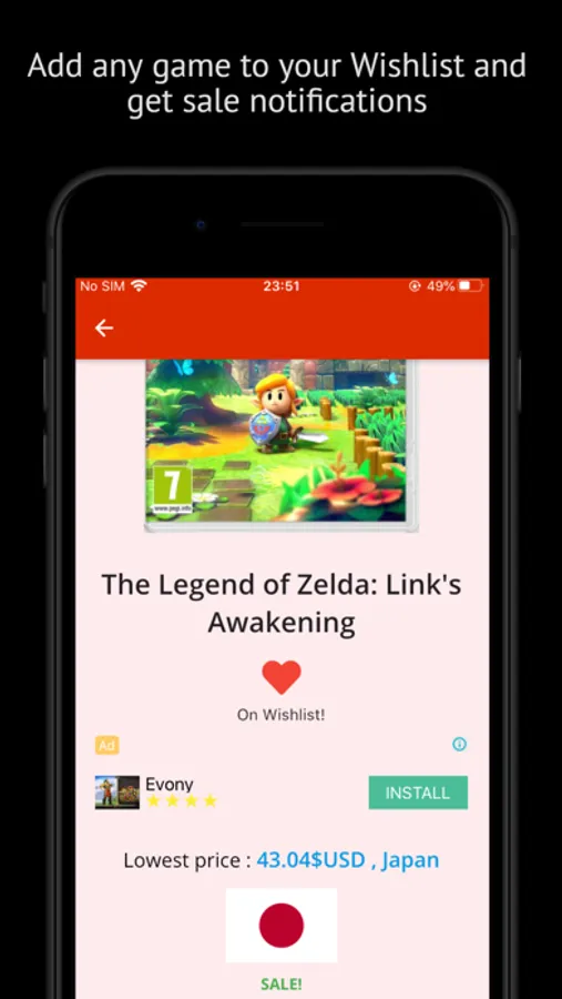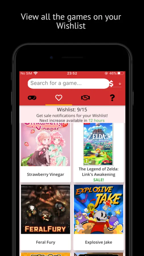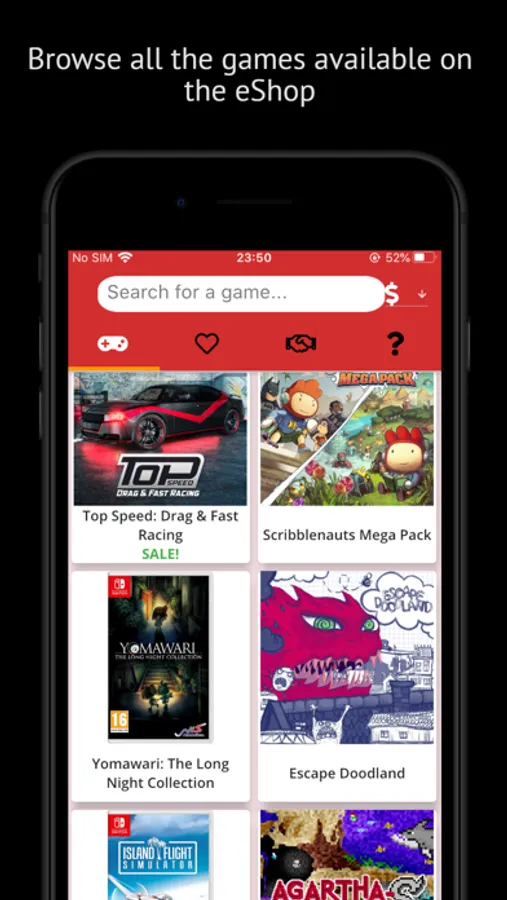 The app shows you a list with every game available to purchase on the Switch eShop, and details about it's price.