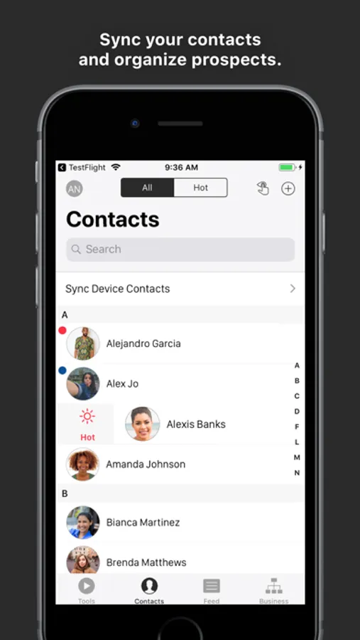 Contacts: Choose how to sync and manage your contacts. Swipe to sort them by interest level. You can make connections, add notes, or check out the Contact Feed to see the tools you've shared and contact actions.