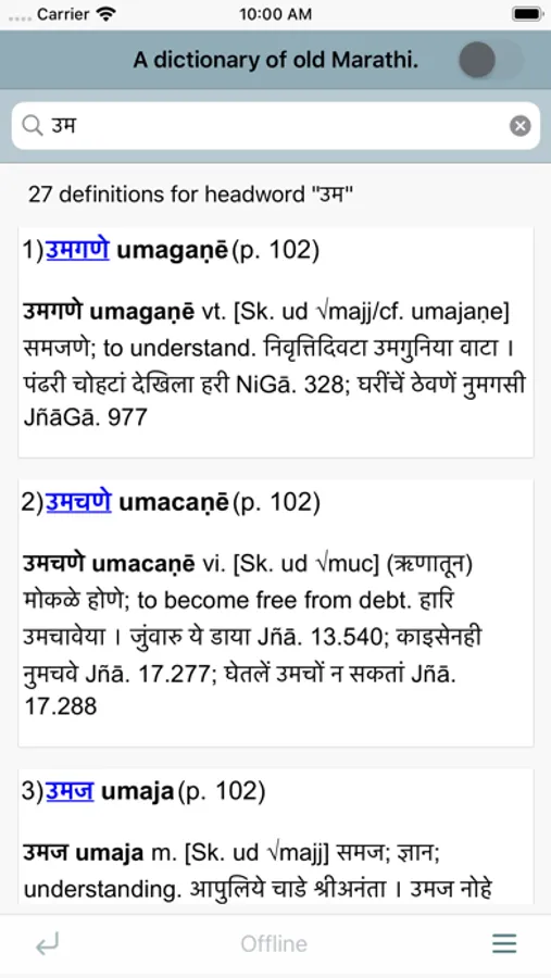 The default mode for this app is to search headwords. To search for a headword, touch the search box at the top (magnifying glass icon) to expose the on-screen keyboard and begin searching. Headwords can be entered in Devanagari, accented latin characters, and unaccented latin characters.