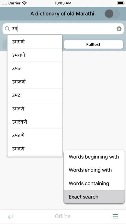 The Old Marathi dictionary app can be used both online and offline. The online version interacts with a database that runs remotely on a server at the University of Chicago. The offline version uses a database that is created on the device upon first download.