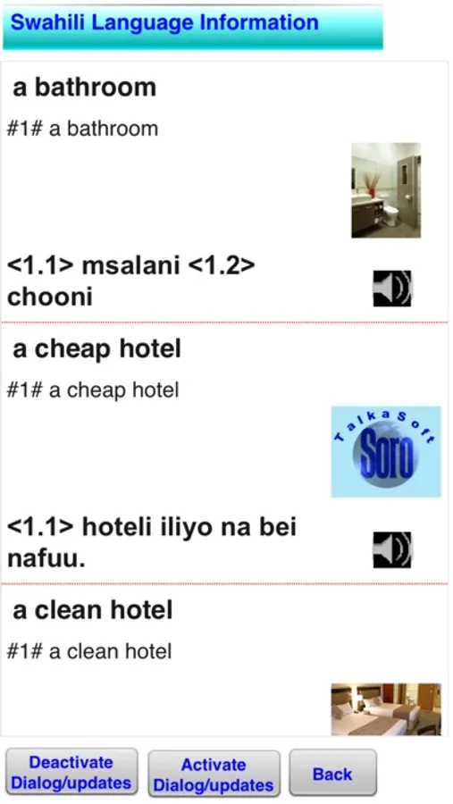 The professional version enables users to update the translated data if they are using it to teach others as there are many ways to speak a language. It also enable users to create new data translations, record and play back or delete audio Swahili data, record and play back or delete dialog audio Swahili data.