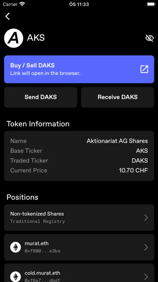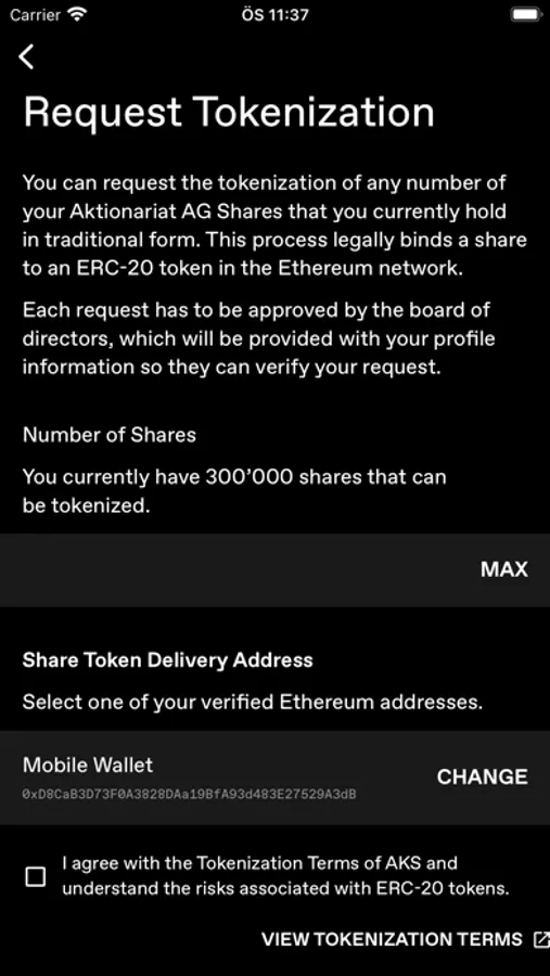 Aktionariat AG also manages the company shareholder registry for its client companies. If you are a shareholder who only holds traditional shares in such a company, you can request tokenization of your shares directly from inside the app. The app automatically fulfills your legal duty to register yourself as a shareholder for all the share tokens you acquire.