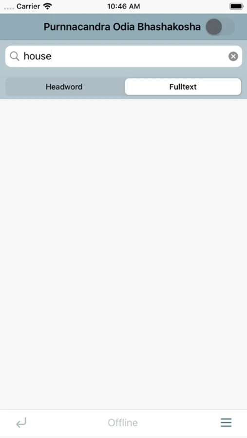 The default mode for this app is to search headwords. To search for a headword, touch the search box at the top (magnifying glass icon) to expose the on-screen keyboard and begin searching. Headwords can be entered in Oriya, accented Latin characters, and unaccented Latin characters.