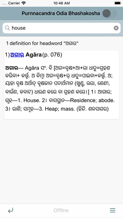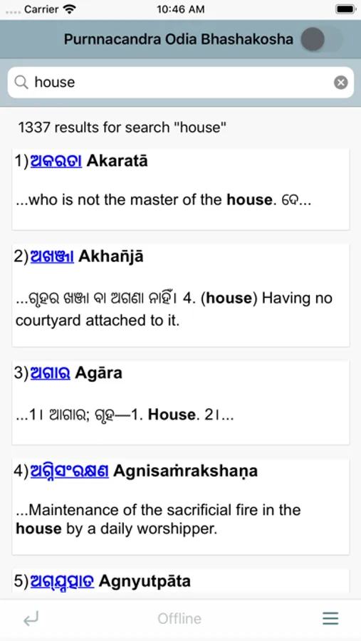 Search results come first in a numbered list that displays the Oriya headword, the accented latin transliteration of the headword, and a chunk of the definition. To see a full definition, touch the headword.