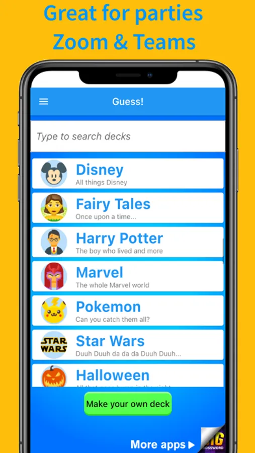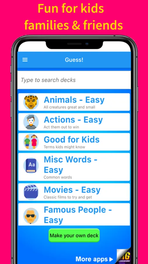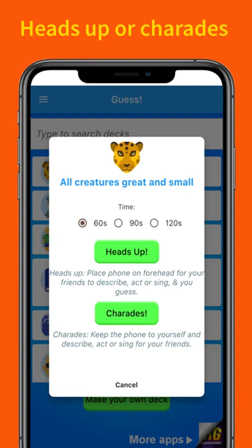 - Charades Mode - keep the word to yourself. Other players must guess the word you describe, mime and act.