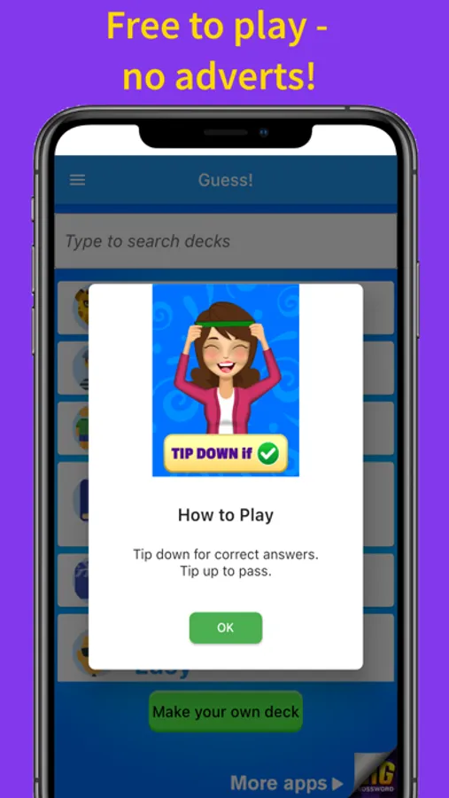 - Heads Up Mode - place phone on your forehead. Other players try and tell you what the word is. Tip down for correct answers, tip up to pass on the word.
