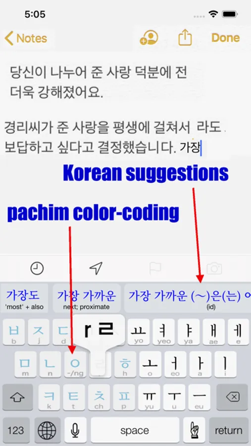 "Hangeul" includes a built-in dictionary that allows you to check on the meaning of Korean words as you type them. It will give color-coded suggestions for the next keypress.