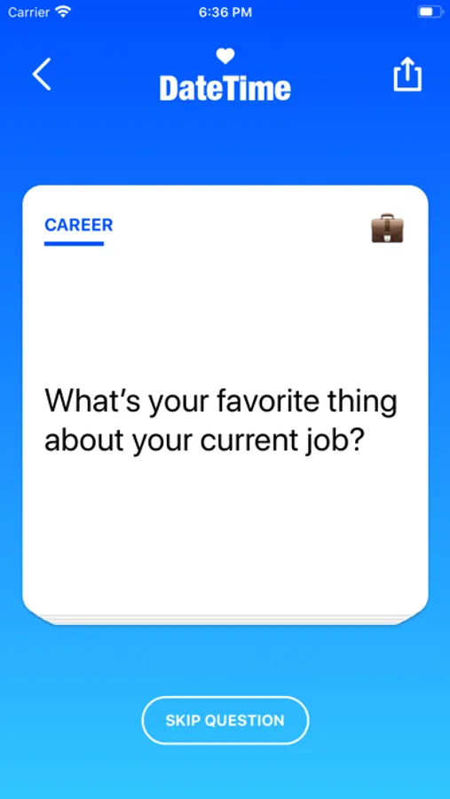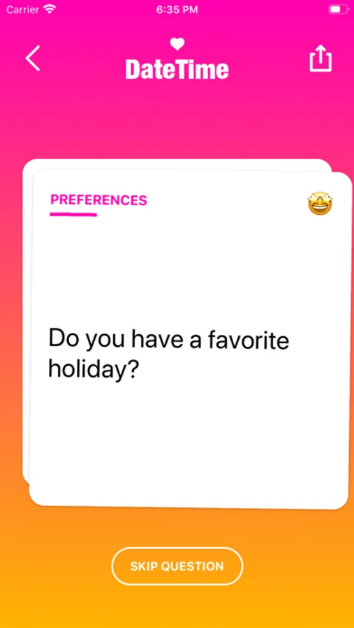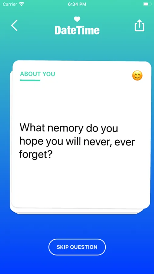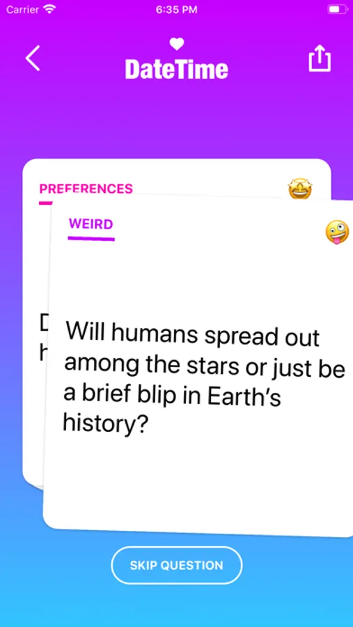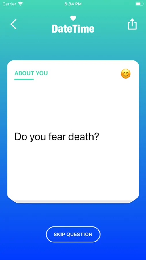 DateTime helps you to overcome awkward silence and establish a deeper connection with your date by providing you with questions in meaningful categories like (Deep, Weird, Career, Love, Dreams, Values ...). Each question brings the two of you closer together and helps you to kickstart further conversations!
