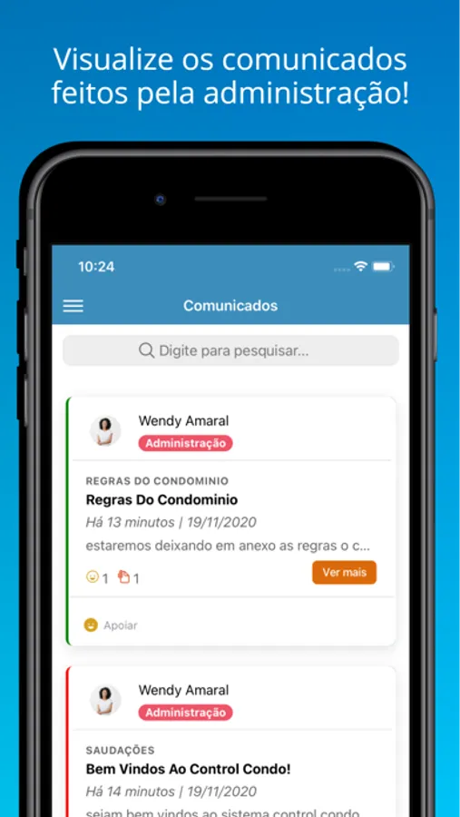 O aplicativo Control Condo é exclusivo para os moradores do condomínio, e foi desenvolvido para facilitar a comunicação entre moradores, síndico e portaria, proporcionando experiências únicas, aproximando as pessoas e melhorando a convivência em grupo.