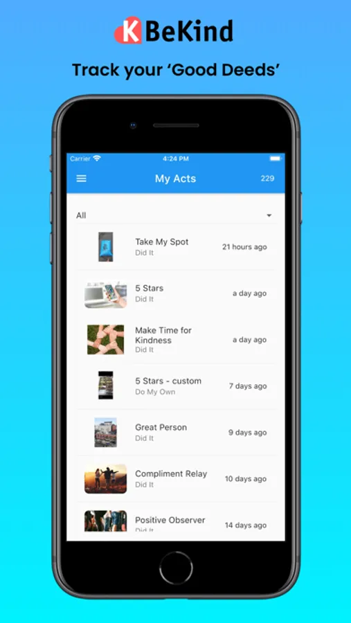 • Community Building. Connect with kind and loving people from around the world. Invite your friends and make new ones. Get inspired by your friends’ acts and communicate with them via comments.