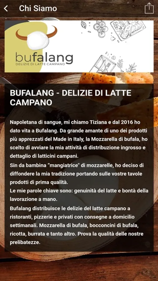 Napoletana di sangue, mi chiamo Tiziana e dal 2016 ho dato vita a Bufalang. Da grande amante di uno dei prodotti più apprezzati del Made in Italy, la Mozzarella di bufala, ho scelto di avviare la mia attività di distribuzione ingrosso e dettaglio di latticini campani.
