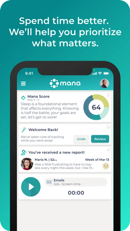 Spend your time better. Mana helps you reach your fullest potential with the easiest time management tool to achieve your goals! Our experts on every time management methodology you can think of are focused on helping you to effectively create more time value in your life. Realizing your dreams requires understanding your priorities. No matter who you are, there are only 24 hours in a day: 168 per week. We help you use them better.