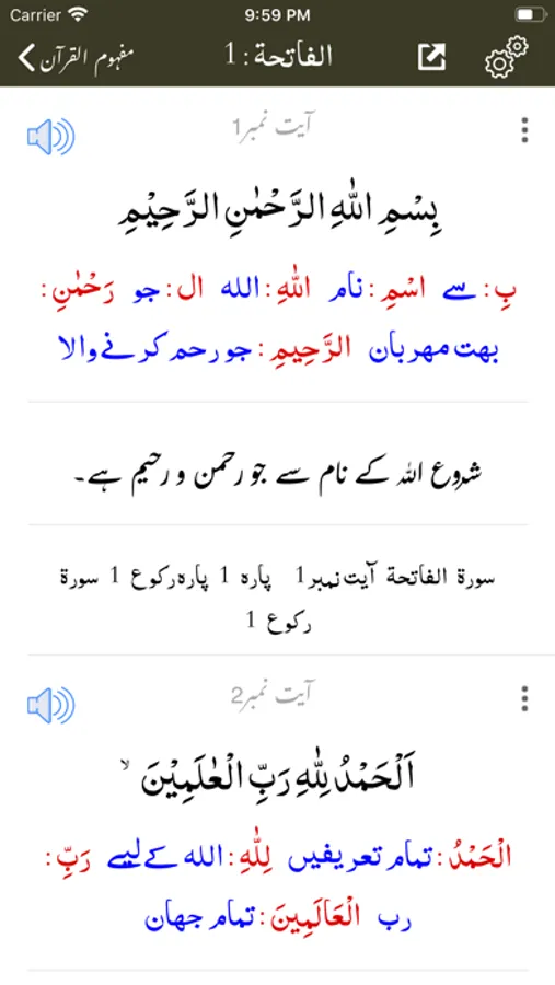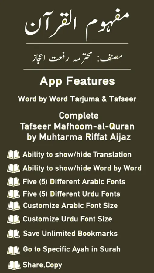 - Ability to show/hide Word by Word, Quran Translation (Tarjuma)