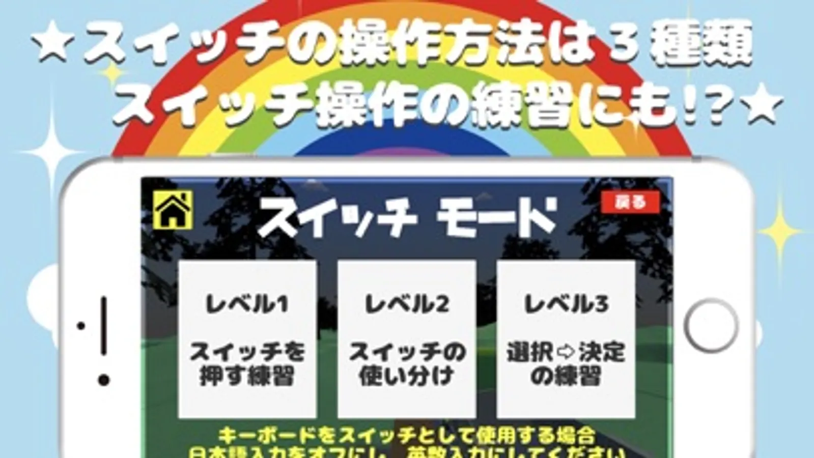 ・スイッチの練習として使えるよう、操作方法をレベル1〜3の3段階から選べるよ!
