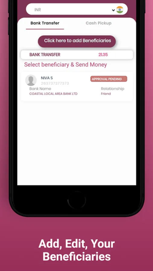 Our App brings an ultimate solution for sending money to your dear ones who have limited access to the banking system, through our Cash PickUp option. In Cash PickUp option the user can send money by entering Beneficiary name, Beneficiary country, Contact number, Nationality and then by selecting the corresponding remittance details. Times of waiting have gone now everything can be done in the nick of time