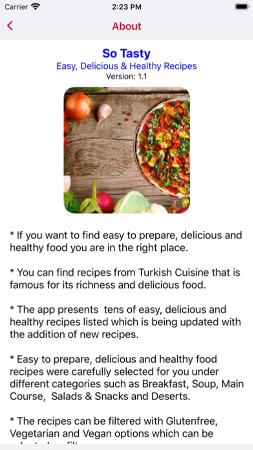 * The app provides tens of easy, delicious and healty recipes listed which is being updated with the addition of new recipes.