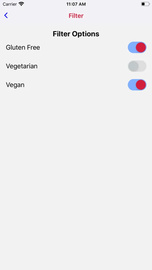 * The recipes can be filtered with Gluten-free, Vegetarian and Vegan options which can be selected on filter page.