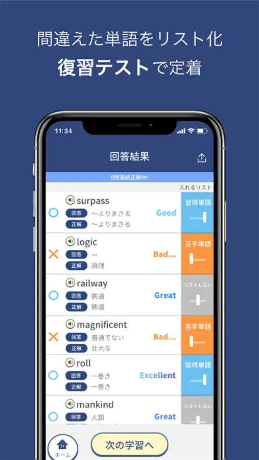 間違えた単語は自動でリスト化。リストから苦手単語を一気に学習できます!復習テストでまとめて苦手→習得へ!
