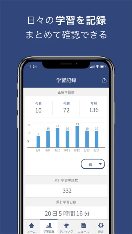 その日正解した単語数や学習時間など、あとあときっと自信につながる学習の記録を自動で行います!