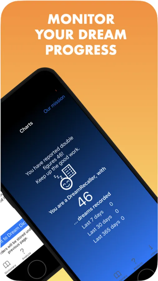 In addition there is a charts tab which allows you to see how many dreams you have logged in total to monitor your progress over the last 7 days, 30 days, and 365 days.