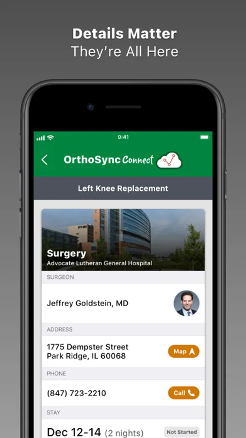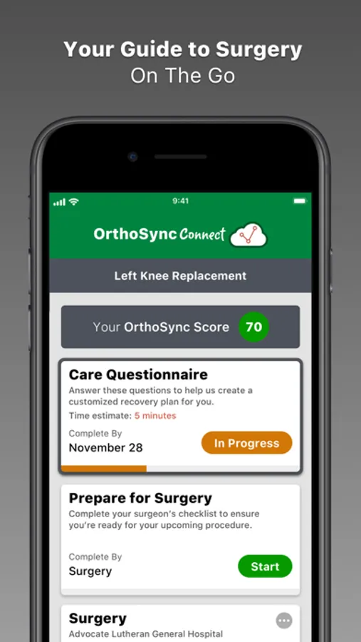 OrthoSync Connect provides all the information you need to optimize your recovery as a patient in the OrthoSync program. It can replace the stacks of paper you're normally given and provide your plan before and after surgery. The main features include: