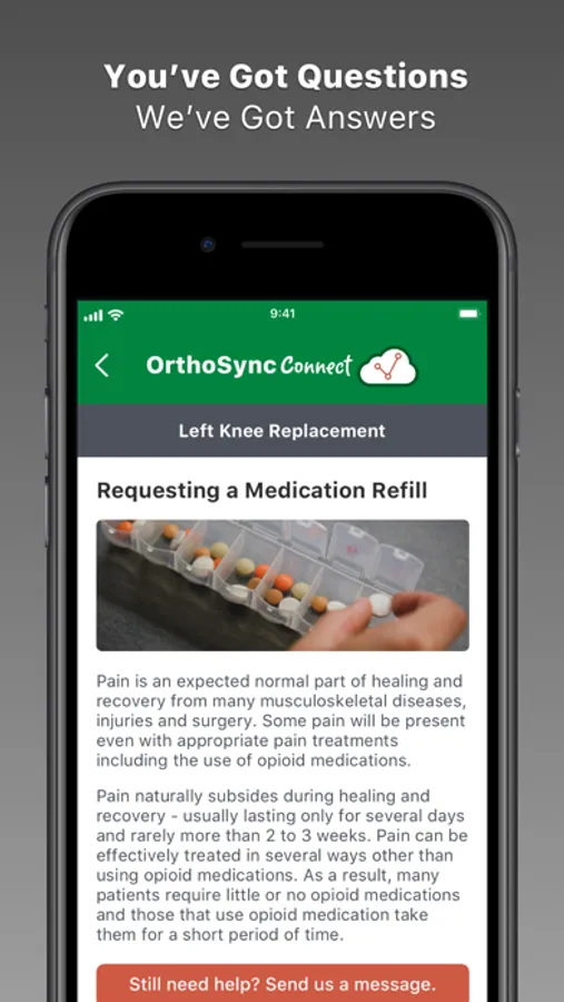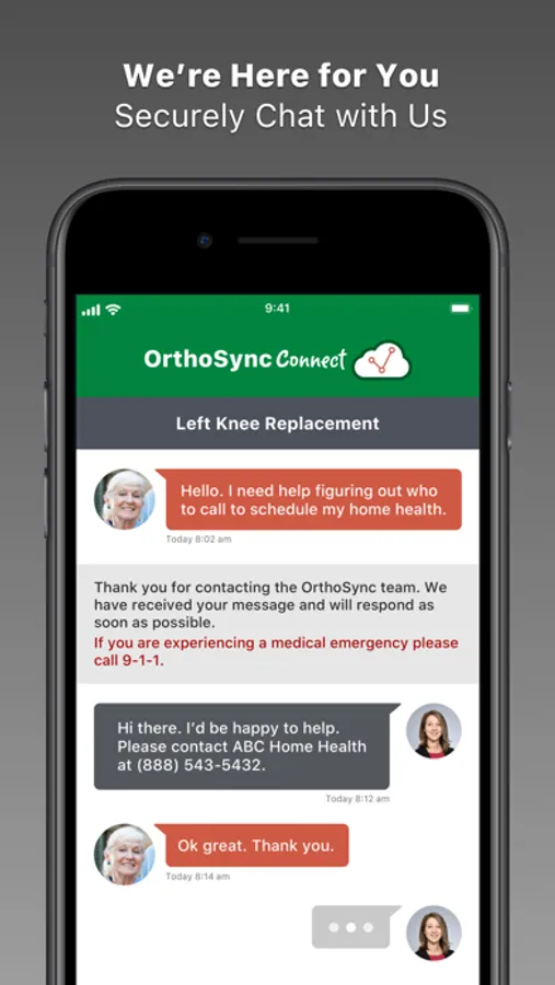 We get it - surgery can be confusing. With OrthoSync Connect, our team is a few taps away. We also provide a full catalog of frequently asked questions to help you get the answers you’re looking for quickly. OrthoSync Connect provides access to your care team in the palm of your hand.
