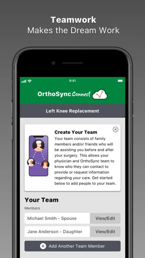 It's important to have a support team during your recovery. In OrthoSync Connect, you can add family, friends, or acquaintances so that we know you will have assistance following surgery.