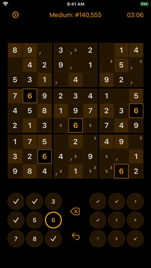 Apparent Sudoku includes support for Dark Mode and full keyboard interaction on iPadOS. Type a number to select it from the palette, or use the Option key to highlight the corresponding note. Navigate around the Sudoku game grid using arrow keys.