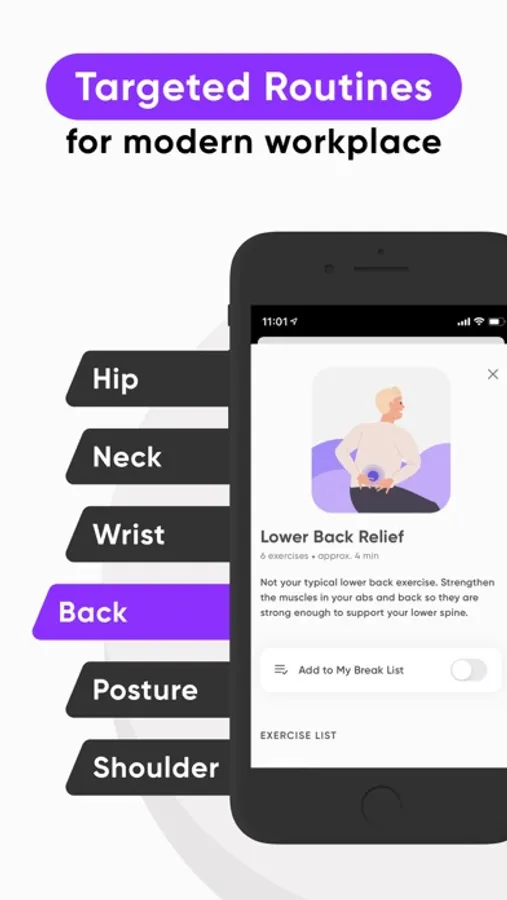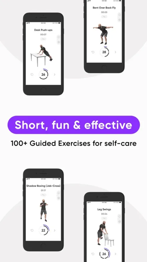 Featuring a continuously expanding library of workplace-friendly guided break routines that are designed to help increase productivity while keeping your health in check, and calm the mind when anxiety peaks.