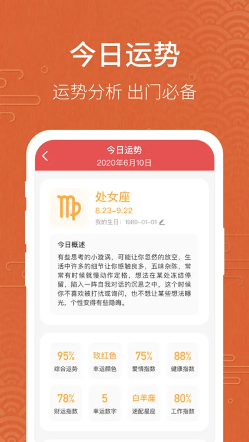 3.特色功能:吉日查询、星座运势、周公解梦、生肖运程;