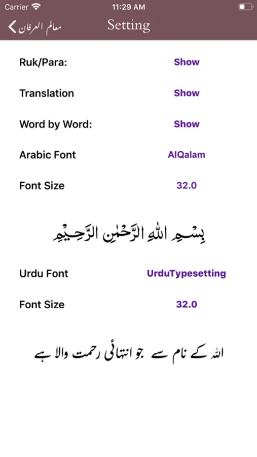 - Ability to show/hide Word by Word, Quran Translation (Tarjuma)