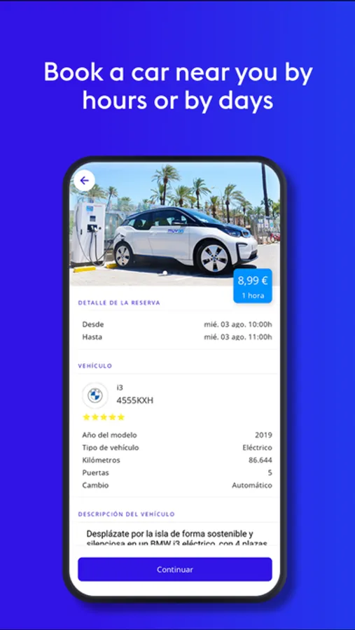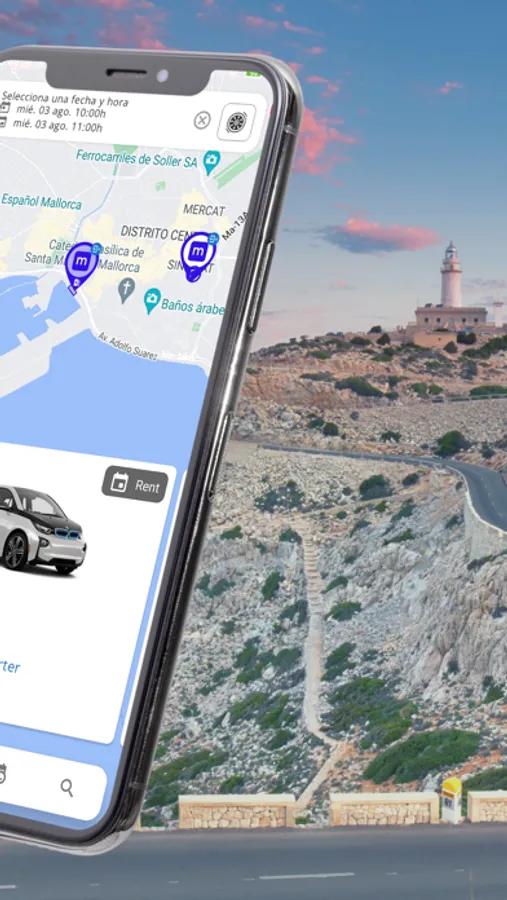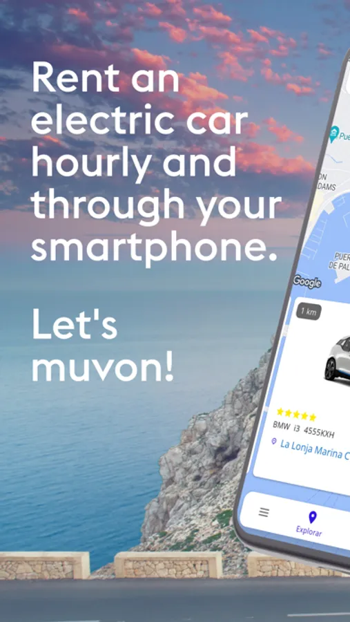 With Muvon you can rent an electric car hourly in Mallorca and pay only for the duration of your booking, starting from 7.2 € / hour. No additional costs: forget about paying the deposit or paying for refueling and parking. Download the Muvon Carsharing app and rent a car through your smartphone, with no queues nor waiting times. Register, book and access the car through the app.