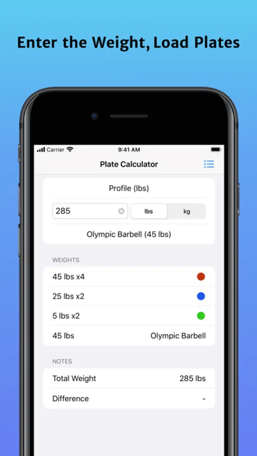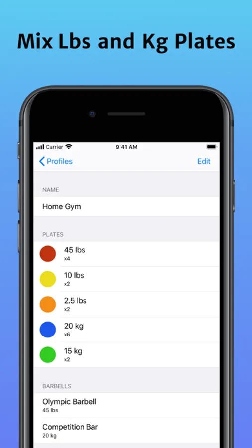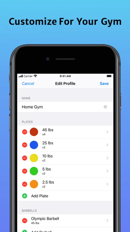 Calculate which plates to load onto the bar easily. Customize your plates and barbells with no limit. Organize them into multiple gyms.
