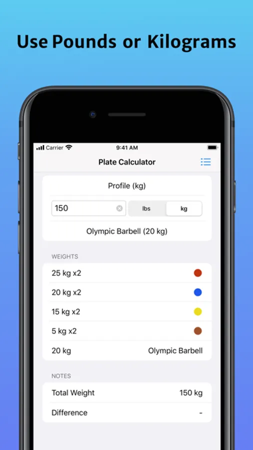 - Create custom plates and barbells of any weight, in kilograms and pounds