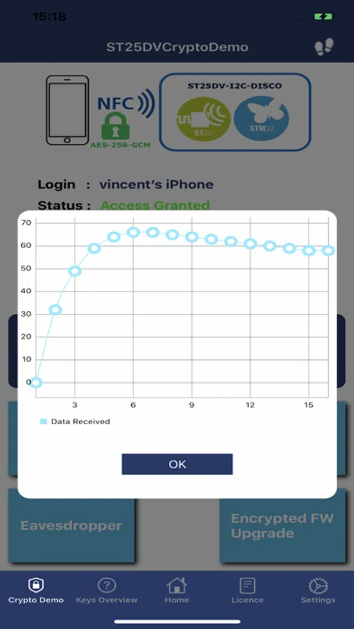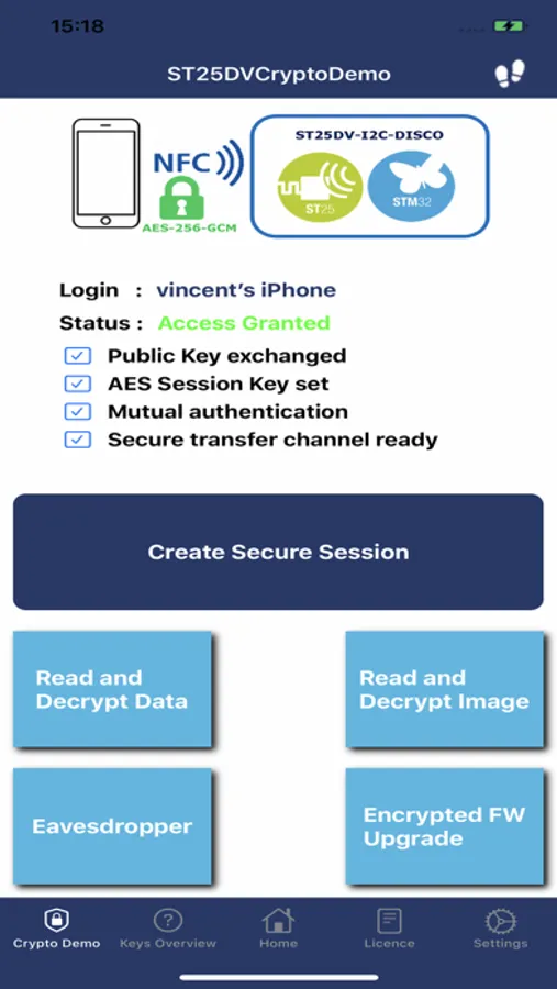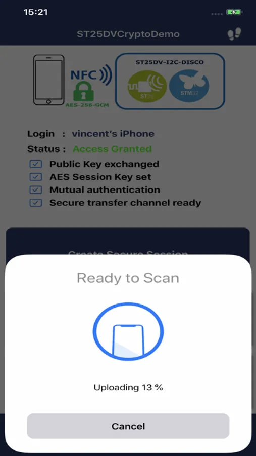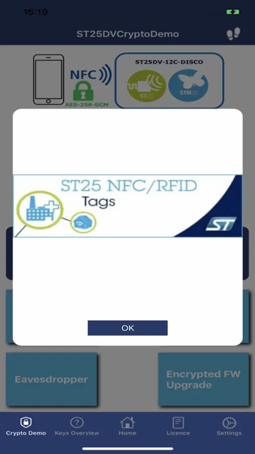 The ST25DV-I2C CryptoDemo iOS application shows how to establish a secure transfer channel over NFC, between an STM32 microcontroller and an iOS smartphone using coreNFC framework.