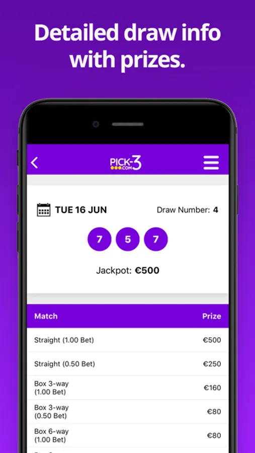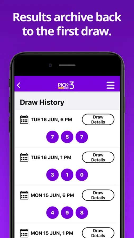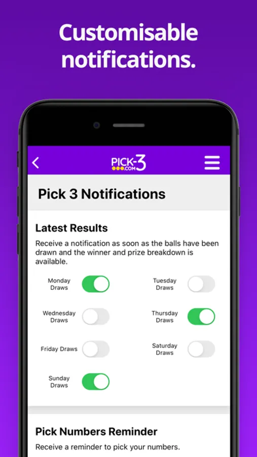 Get notified instantly when the latest Pick 3 results become available. The App allows you to customise notifications for which days of the week you participate. There is also the option to set notifications at times that suit you - great for reminding you to bet before the result.