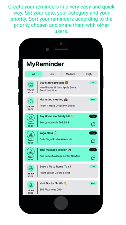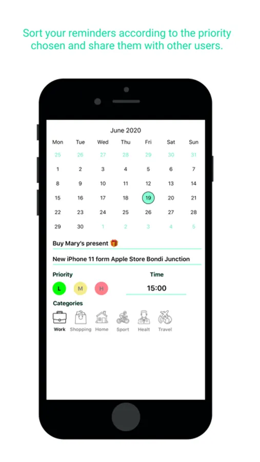 - Reminders : Create your reminders in a very easy and quick way. Set your date, your category and your priority. Sort your reminders according to the priority chosen and share them with other users